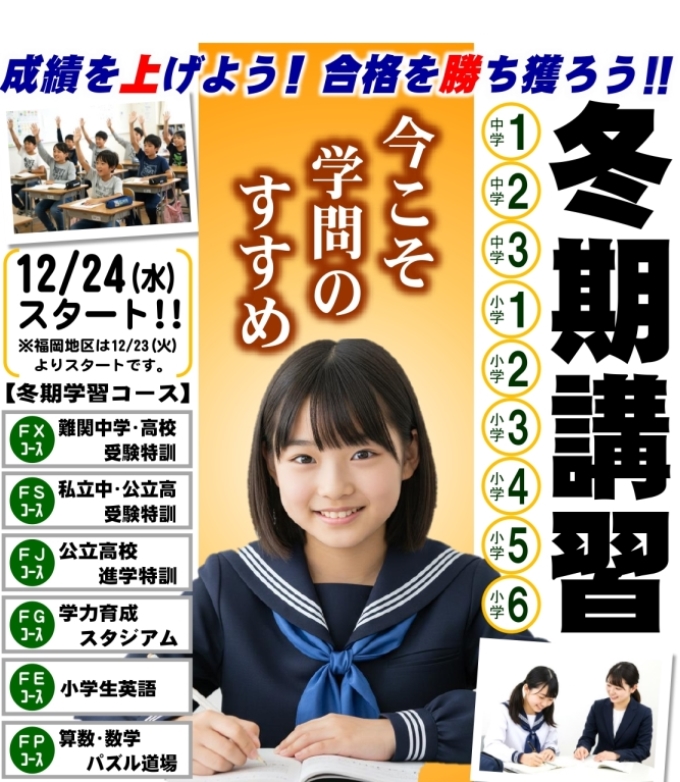 | 中3 | FS | 12/23(24)~1/6(7) | 13:00~15:55 | 40時限 | 国・数・社・理・英 |