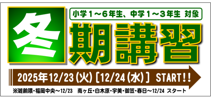 【年末年始合格特訓】 期間:12/31~1/2 時間:12:40~18:00 実施校舎:南ヶ丘・白木原・福岡中央・宇美スクール