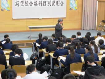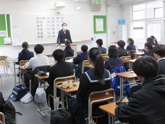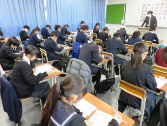 生徒のみなさんがそろったら、いよいよ試験開始です。、試験監督の先生から、本日の諸注意や入試の心構え、本番を想定して緊張感を持ってテストに臨むことなどいろいろな事前説明があり、「はじめ」の合図とともにテストが開始されました。