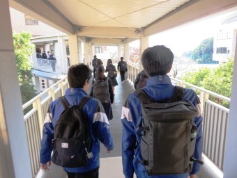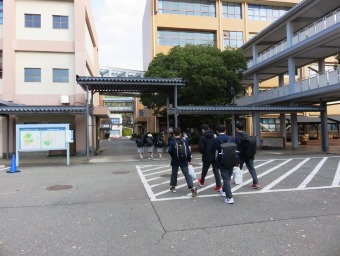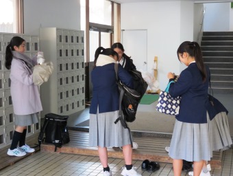 生徒のみなさんは、二号館の玄関から入場し、上靴にはきかえ、いよいよ各教室へと階段をのぼっていきます。
